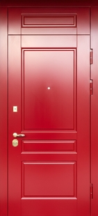 Металлическая дверь с верхней вставкой и окрашенными панелями МДФ (красный цвет RAL 3020) — отражает современный взгляд на комфорт и безопасность. МДФ-панели сохраняют насыщенность цвета даже при длительной эксплуатации. Создают эффект архитектурной завершённости. Отделка подойдет владельцам домов с деревянным фасадом.