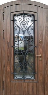 Морозостойкая арочная термодверь с большим стеклом, решеткой и панелями МДФ со шпоном КД-1285