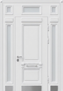 Парадная входная группа с терморазрывом, отбойниками, стеклами и белыми панелями МДФ RAL с багетом — выбор тех, кто ищет надёжную и эстетичную входную дверь. Панели из МДФ обеспечивают отличную шумоизоляцию и устойчивость к влаге. Поддерживают визуальную симметрию пространства. Дизайн подойдет для домов с классическим и современным оформлением.