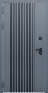 Стальная дверь с полимерным окрашиванием серого цвета и вертикальными черными рейками КД-1415