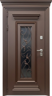 Утепленная входная термодверь с металлобагетом, карнизом, стеклопакетом, ковкой и коричневым полимерным покрытием представляет собой современное решение для оформления фасада и интерьера. Благодаря продуманной конструкции дверь подходит для установки как внутри помещений, так и на фасадах зданий.